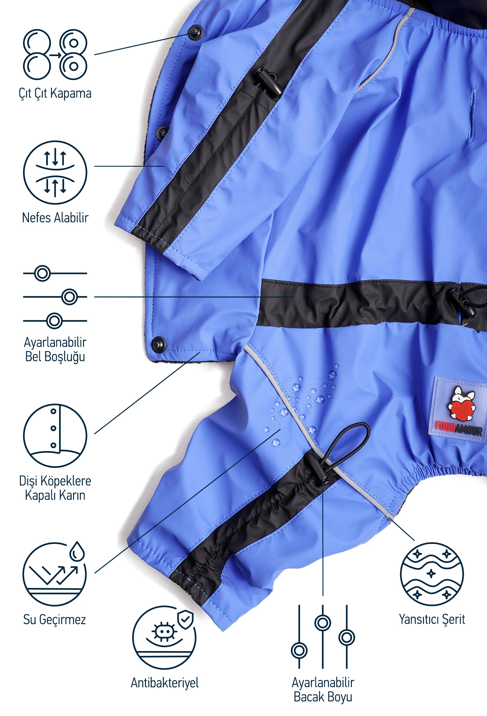 FOURAMOUR Gökyüzü Mavisi Su Geçirmez Dişi Köpek Tulumu, yağmurlu günler ve kış mevsimi için özel olarak tasarlanmıştır. Bu tulum, tüylü dostunuzu kuru, sıcak ve rahat tutarak dış mekan aktivitelerini daha keyifli hale getirir. Şıklıkla fonksiyonelliği birleştiren FOURAMOUR, köpeğiniz için mükemmel bir tercihtir.