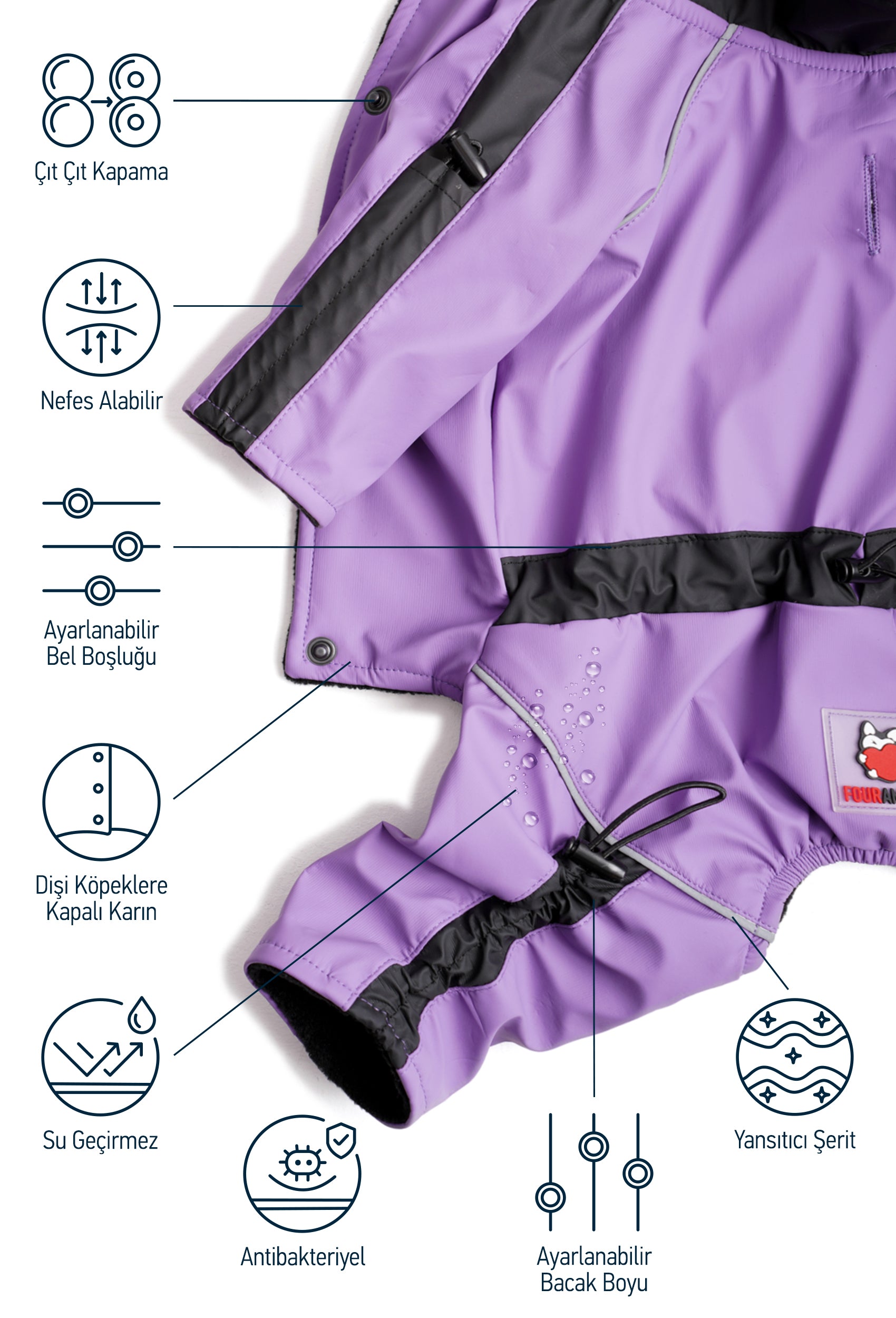 FOURAMOUR Pastel Mor Su Geçirmez Dişi Köpek Tulumu, yağmurlu günler ve kış mevsimi için özel olarak tasarlanmıştır. Bu tulum, tüylü dostunuzu kuru, sıcak ve rahat tutarak dış mekan aktivitelerini daha keyifli hale getirir. Şıklıkla fonksiyonelliği birleştiren FOURAMOUR, köpeğiniz için mükemmel bir tercihtir.